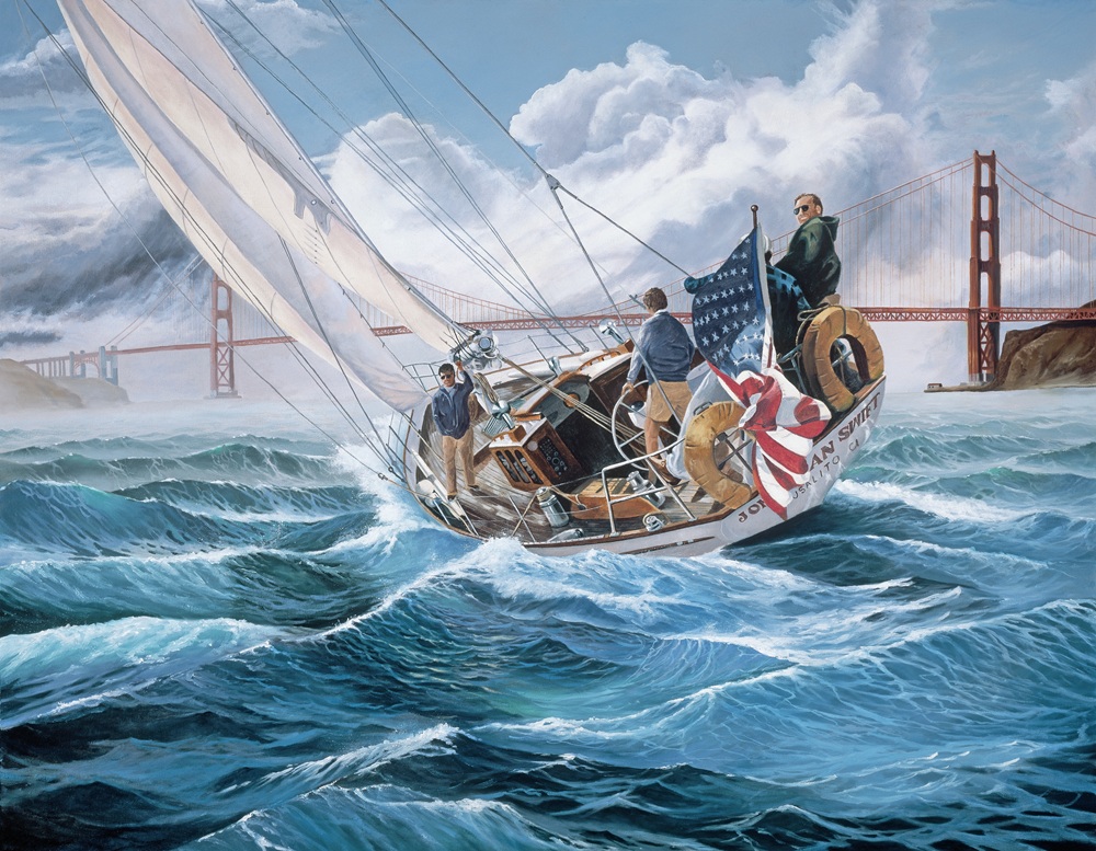 This painting holds special significance, as it was created for a close friend who spent thirteen years owning and racing a remarkable 60-foot yacht in the waters surrounding San Francisco Bay. The vessel, known as the Jonathan Swift, boasts a unique and storied history that spans continents and decades.