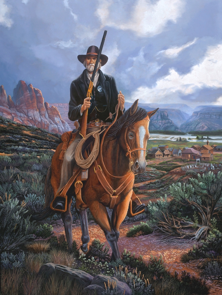 During the late 1800’s, the Marshal was the sole guardian of the rule of law and the only one standing between law abiding citizens and criminals in the western territories. He traveled long distances, worked long hours, and endured many hardships to bring the lawless to justice. Sometimes, as depicted in the background of this painting, he had to put some six feet under, either by gun or by rope.